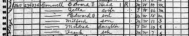 Edward B. Conwell, Sr. is listed here with his wife, Zella, and children Edward B., Milford, Mildred and Frank. Breaking the census listing down into three parts will help us view the information a little easier:
